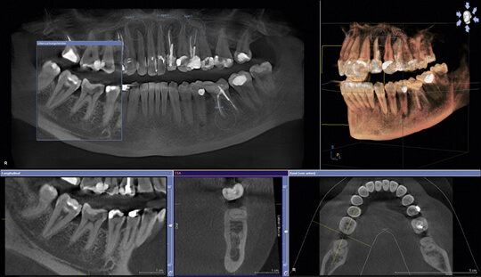 三次元の立体画像を得られる歯科用CTにより、様々な方向から詳細な情報を得て、見えなかった部分を確認、診査することができるようになりました。