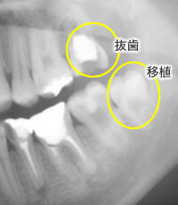 根の先の病巣が大きいなど、状態が良くない歯の場合、根の治療のみでは治癒は期待できず、やむなく抜歯になってしまうケースがあります。 その場合、他の歯(例えば、親知らず)を抜いた部分に戻す移植法と、患歯を1度抜いて治療して戻す再植法があります。