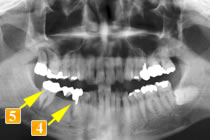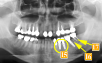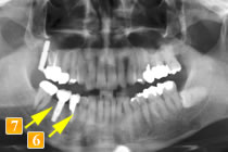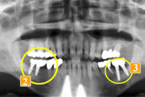 )は、ブリッジが長かったためか、親知らずが溶けてしまっています。負担の大きい手前の2本の小臼歯も揺れていました。